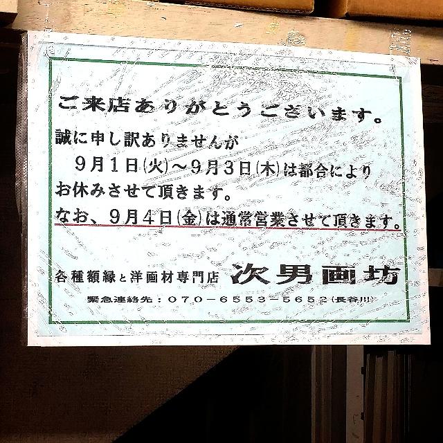 尚、それにともない武蔵小金井の各種額縁と洋画材専門店『次男画坊』は期間中はお休みさせて頂きますのでぜひご用の際は『画廊』の方へ足をお運び頂ければ幸いです。